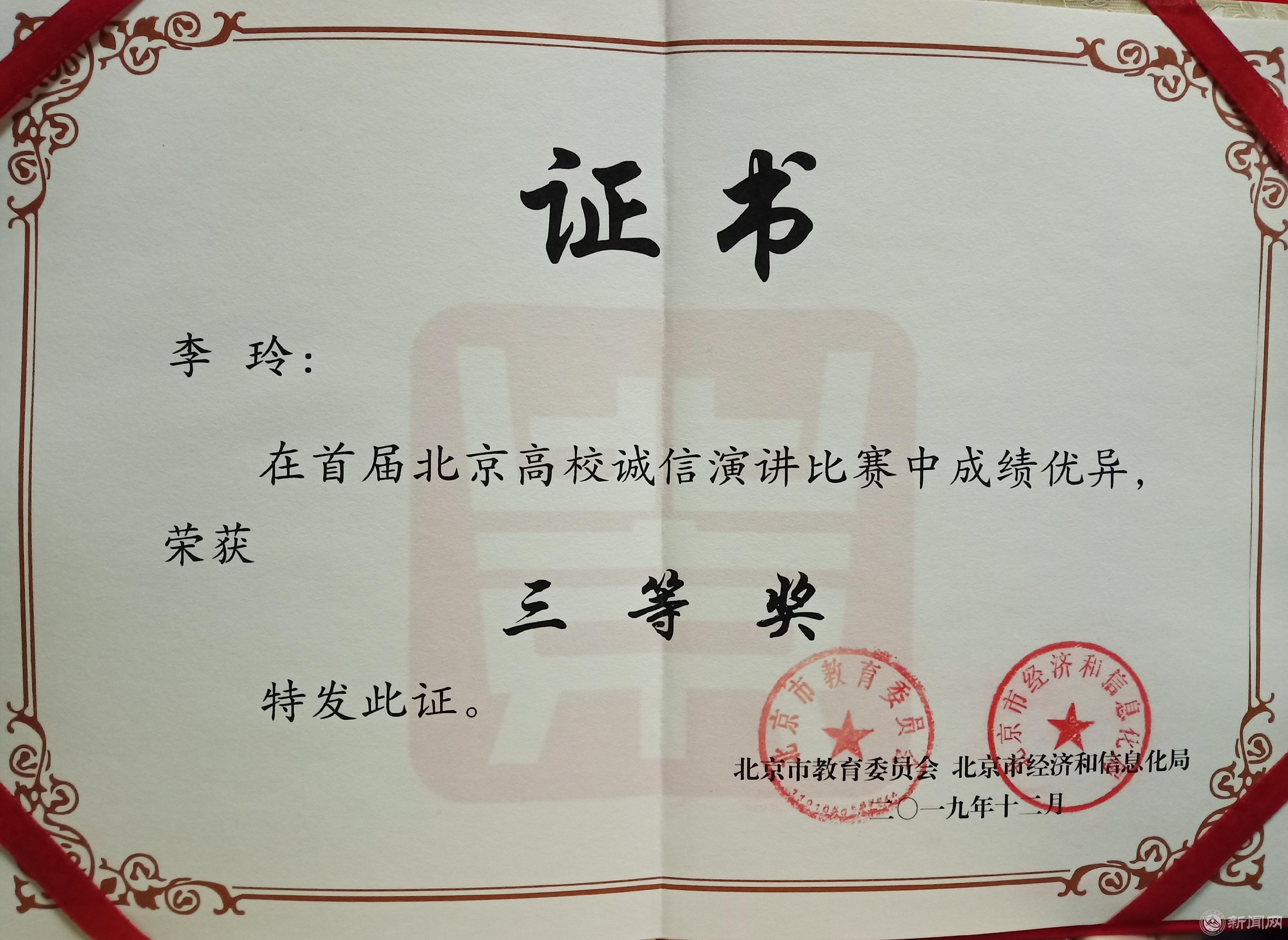 近日,以“诚信我践行·风采耀京城”为主题的“首届北京高校诚信演讲比赛”在京举行,来自世界杯文法学院的中文18-2班李玲同学最终获得三等奖。