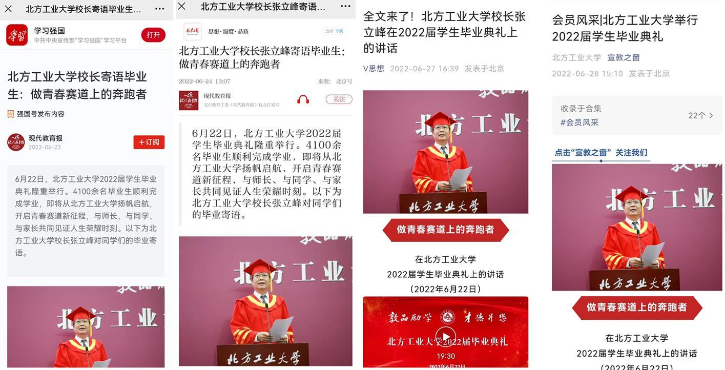 张立峰校长的致辞引经据典、精彩纷呈,风趣幽默、饱含深情,是一堂精彩、生动的“大思政课”,在学校师生中引发热烈反响,受到社会主流媒体的关注报道,学习强国、北京日报、V思想、宣教之窗、中国网等主流媒体平台纷纷进行转载报道。