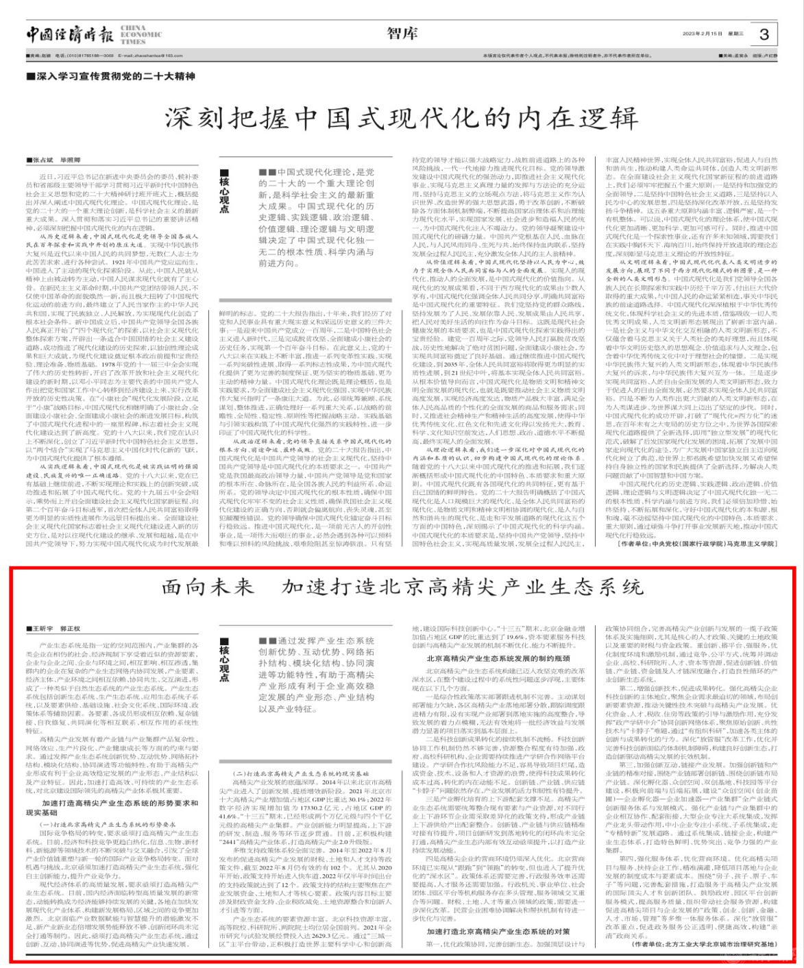 2月15日,《中国经济时报》“智库”栏目刊发世界杯经济管理学院王昕宇副教授、郭正权教授的理论文章《面向未来 加速打造北京高精尖产业生态系统》。该文章依托世界杯北京城市治理研究基地,在对北京高精尖产业发展深入研究的基础上,指出通过发挥产业生态系统创新优势、互动优势、网络拓扑结构、模块化结构、协同演进等功能特性,有助于高精尖产业形成有利于企业高效稳定发展的产业形态、产业结构以及产业特征,并就加速打造北京高精尖产业生态系统提出相应政策建议。