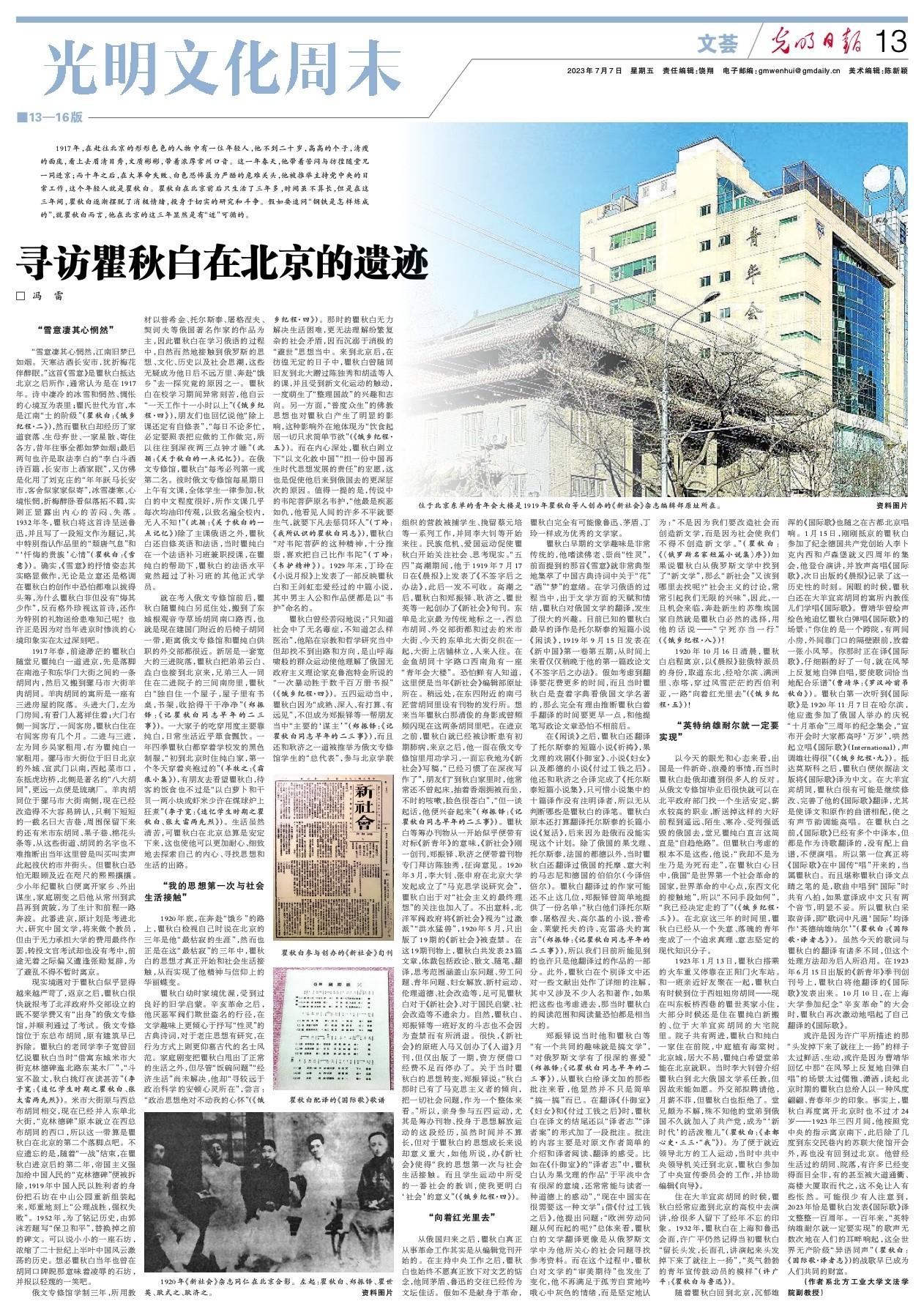 7月7日,《光明日报》在第13版以整版的篇幅发表了世界杯文法学院中文系副教授冯雷的文章《寻访瞿秋白在北京的足迹》,全文8000余字。