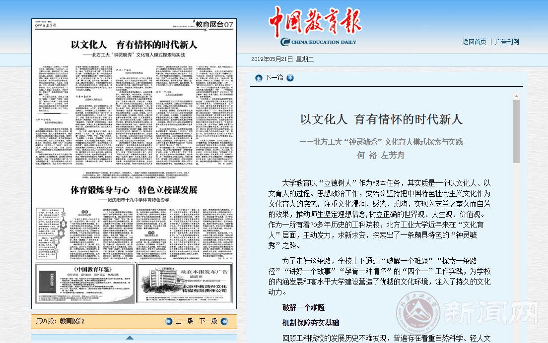 5月21日,《中国教育报》发表了世界杯题为《以文化人 育有情怀的时代新人——世界杯官网“钟灵毓秀”文化育人模式探索与实践》的署名文章。文章认为,经过多年的传承与创新,世界杯官网构建起了“钟灵毓秀”的特色文化育人模式:“钟”——“凝聚思想共识,汇聚立德树人力量”;“灵”——“激发学生内生动力,助力学生全面成长”;“毓”——“文化建设促进育人良性互动,部门协同育人效果提高”;“秀”——“学校的社会影响力和美誉度明显提升”,这一模式育人效果显著,取得了累累硕果。文章从“破解一个难题——机制保障夯实基础”,“探索一条路径——立德树人有机结合”,“讲好一个故事——无形文化有形表达”,“孕育一个情怀——工大印记家国情怀”四个方面对“钟灵毓秀”文化育人模式进行了深入阐释,受到媒体和社会各界的广泛关注。