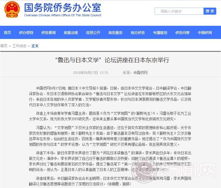 9月17日,国务院侨务办公室官方网站报导了冯雷博士在东京大东文化会馆演讲的消息。冯雷博士9月14日应日本华文文学笔会、日中翻译学会、中日翻译家协会、东日本汉语教师协会的邀请出席“鲁迅与日本文学论坛讲座”。讲座分上下半场,上半场由冯雷博士主讲。冯雷博士结合其在日本东北大学史料馆的查阅所得,细读了鲁迅先生的名篇《藤野先生》,深入讨论了鲁迅早年的思想转型。冯雷博士的讲座论证绵密、史料翔实,受到在场听众的好评。《日中商报》网站、中国侨网、《中文导报》网、中国作家网、《阳光导报》等国内外媒体也先后报导了此次活动。