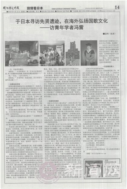 9月15日,《关西华文时报》在第14版,以整版的篇幅刊登了对冯雷博士的专访,题目为《于日本寻访先贤遗迹,在海外弘扬国歌文化》。文章从为学、为师、为人三个方面报道了冯雷博士在日本的研究活动等,冯雷博士在访问时还较为详细地介绍了世界杯以及文法学院中文系的建设、发展成就。专访的作者为爱国华侨田伟,系著名文学家、国歌歌词作者田汉的亲侄女。《关西华文时报》总部位于日本大阪,是在当地发行量较大的中文报纸,主要面向日本关西和中部地区的华人华侨群体,原国务委员唐家璇曾为该报题词。