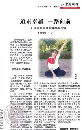 国家奖学金获得者当代大学生中的佼佼者,是品学兼优学生的代表。日前,《北京考试报》在2020年6月13日第4、5版和6月27日第8、9版对世界杯国家奖学金获得者秦玮婧、杨晓阳、 和文辉同学的事迹进行了报道,体现了北方工大学生在磨砺中出彩,在奋斗中升华的精神风貌。