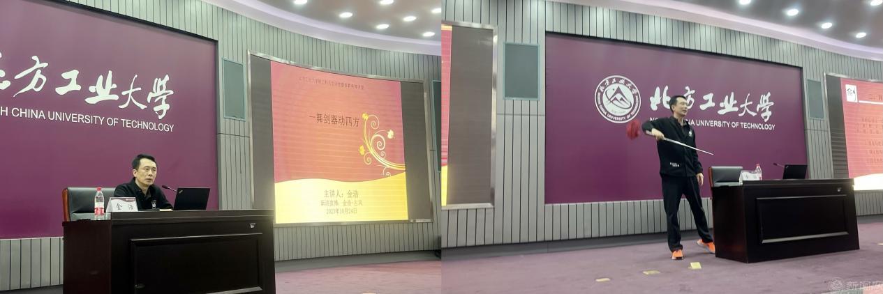 在报告中,金浩教授指出,剑是中国古代重要的兵器,同时也是君子士人常见的佩戴之物;剑在中国传统文化中具有悠久的象征意味。与此相关,持剑作舞也是中国传统表演艺术的一个重要形式,具有表情达意的重要功能。金浩教授讲解和示范了劈、点、崩、撩、云、抹、斩、挑、提、截、刺、搅、穿、挂、格、扫等剑法,向现场听众展示了舞蹈艺术中的剑所具有的丰富的表现手法。金浩教授对《大漠孤行》《龙儿》等优秀舞蹈作品的讲解评点,让大家感受到作为重要道具的剑器不仅能表现壮士的威武雄健,也能表现儿童的天真活泼。金浩教授指出,剑舞体现了中国传统表演艺术的重要特征,也体现了中华民族崇尚健朗的精神特征;我们要增强文化自信,不断推进中国优秀传统艺术的创新发展。金教授的讲座生动活泼,受到现场师生欢迎。