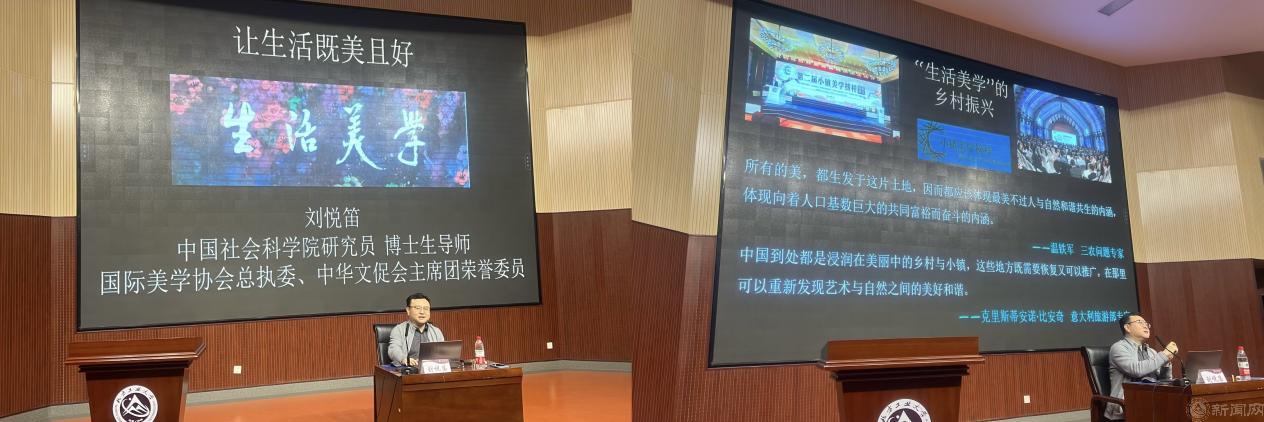 在讲座中,刘悦笛指出,中国的传统美学是一种“生活美学”,体现了古人的精神追求和生活智慧。他介绍了中国古典生活美学中的相关“美”景,如“天气时移”的天之美、“地缘万物”的地之美、“鉴人貌态”的人之美、“饮馔品味”的食之美、“长物闲赏”的物之美、“幽居雅聚”的居之美、“山水悠游”的游之美等。感受、体验到这些美,就会让我们的日常生活有诗意、有情趣起来。他说,美育就是生活本身,人人可以成为“生活艺术家”;我们要向美而生、循美而行,创造更加美好的生活。