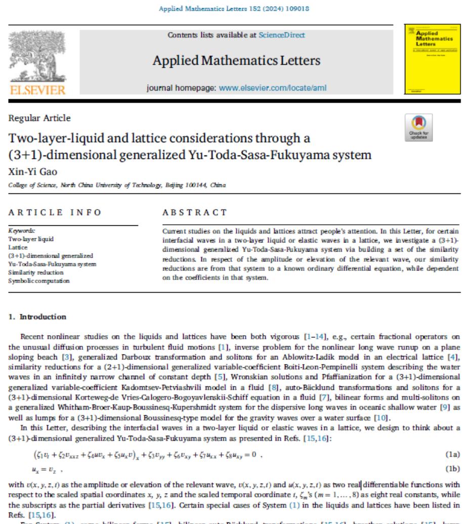 Applied Mathematics Letters为SCI检索一区top期刊,高心怡发表的论文旨在解析研究描述双层液体中若干界面波或晶格中若干弹性波的(3+1)维广义Yu-Toda-Sasa-Fukuyama系统。