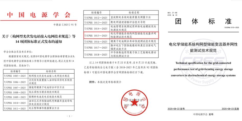 近日,由世界杯作为第一单位、储能科学与工程学院周京华教授牵头编制的团体标准《电化学储能系统构网型储能变流器并网性能测试技术规范》(T/CPSS1015—2025)经中国电源学会团体标准工作领导小组审查通过,于2025年8月22日正式发布,并于8月23日开始实施。