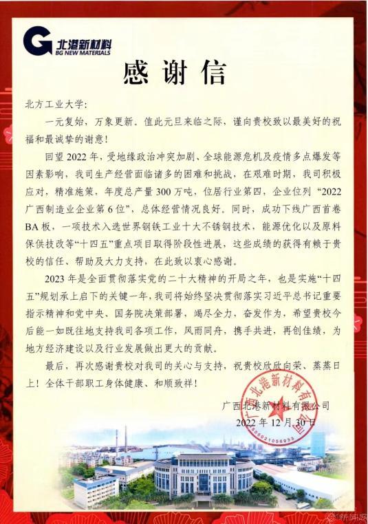 学校深入学习贯彻落实党的二十大精神,促进科技成果转移转化,努力提升服务社会经济发展能力。近日,广西北港新材料有限公司向学校发来感谢信,感谢过去一年学校为北港新材料发展提供的关心、帮助与大力支持。