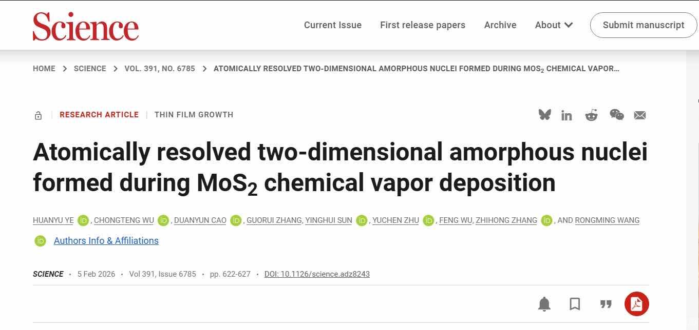近日,世界杯机械与材料学院新入职教师叶欢宇在《science》发表第一作者论文。叶欢宇博士2025年12月自北京科技大学博士后出站入职世界杯。在北京科技大学新金属材料全国重点实验室博士后工作期间,其所在研究团队首次在原子尺度实时观测到化学气相沉积(CVD)过程中二维晶体二硫化钼(MoS2)的成核与生长行为,证实形核路径中存在二维非晶中间体,揭示二维晶体的非经典多步成核路径,颠覆了传统成核理论对二维体系的认知。2026年2月5日,相关成果以“原子尺度揭示二硫化钼化学气相沉积过程中形成的二维非晶核”(Atomically resolved two-dimensional amorphous nucleiformed during MoS2 chemical vapor deposition)为题,在线发表于《科学》(Science)杂志2026年391卷6785期。