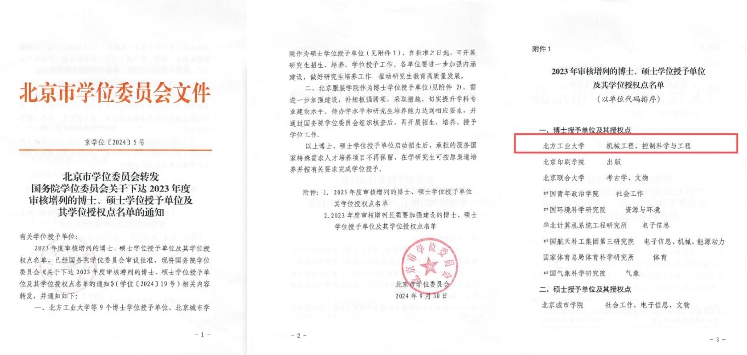 学校将申博工作作为战略重点推进,立足长期以来积累的扎实学科基础与人才储备,组建校院两级申博工作专班,经过多轮调研论证及40余次协调推进会议,持续完善申报材料。2024年9月,根据国务院学位委员会正式通知,学校成功获批博士学位授予单位,机械工程、控制科学与工程两大优势学科获批一级学科博士学位授权点。这一历史性突破标志着学校形成了“学士-硕士-博士”完整人才培养体系,是学校发展的重要里程碑,对拓展人才培养维度、增强学校核心竞争力具有重要支撑作用。