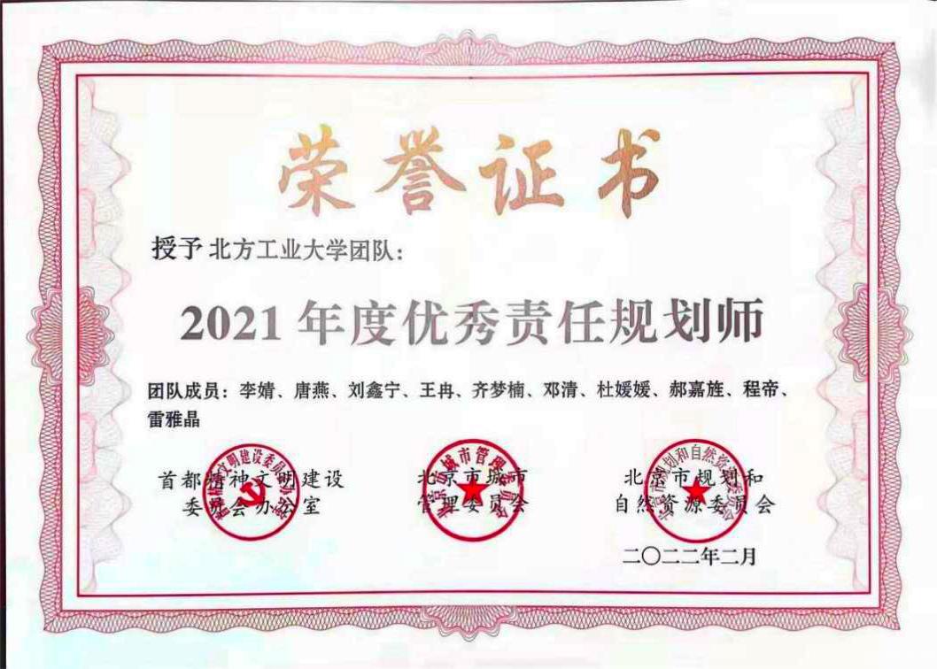 面向首都城市更新和规划需求,12名教师在北京市石景山区、朝阳区、丰台区、副中心四个行政区担任街道责任规划师,创建了“1+3”城市治理模式,将健康城市、韧性城市、智慧社区、精细化设计等理念付诸实践,成果广受好评,3个团队获得北京市规自委年终评优表彰,6人获得“优秀责任规划师”称号。责任规划师在石景山苹果园街道的相关工作在全区考核排名第一,在朝阳区小关街道微空间改造项目获得最佳方案等奖项。