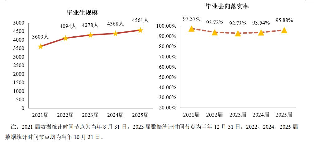 学校毕业生规模逐年递增,2025届毕业生总数达4561人。学校毕业生去向落实率保持稳定。2025届研究生毕业去向落实率达98.08%,普通本科生(不含二年制本科)落实率95.88%。