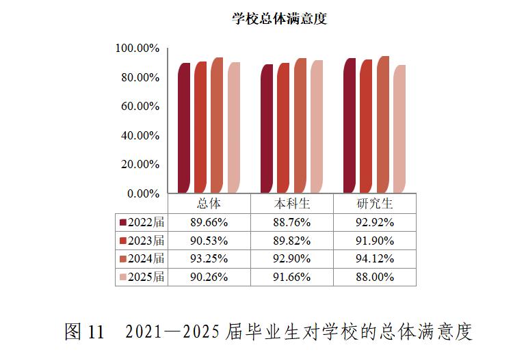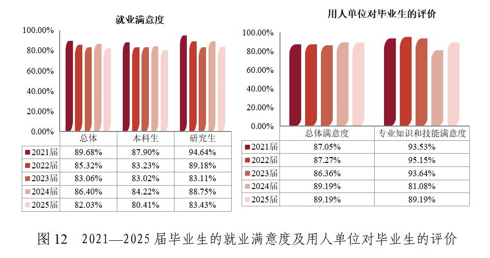 “十四五”期间,毕业生对学校的总体满意度较高,稳定在90%左右;毕业生就业满意度稳定在82%以上,用人单位对毕业生总体满意度超过 86%,对专业知识和技能的满意度保持在 90% 左右。