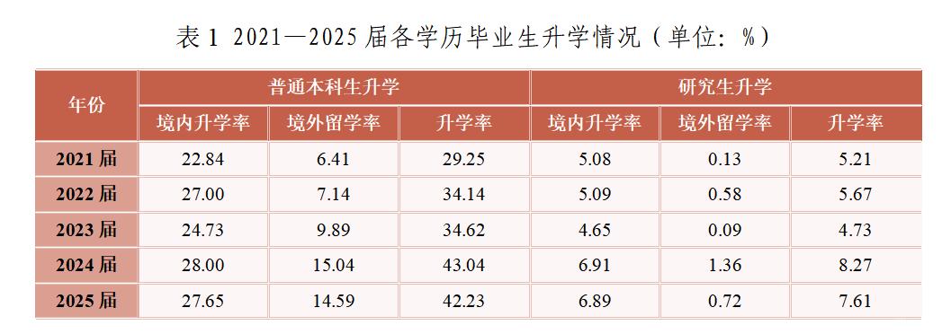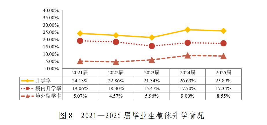 “十四五”期间,学校整体升学率保持增长,近两届保持在25%以上。学生升学意愿持续增强,2024届和2025届升学率分别达到43.04%和42.23%,研究生升学率在2025届达到7.61%。境外留学率从2021届的6.41%升至2025届的14.59%,增幅明显。