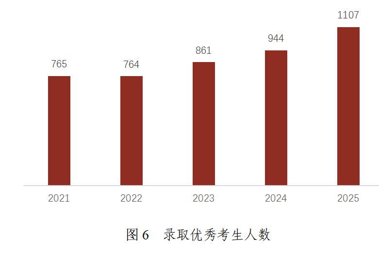 “十四五”期间,学校生源吸引力不断增强,质量稳步提升。在全国20余招生地区,理工科录取平均分位居前10%左右。录取优秀考生人数逐年递增,从2021年的765人增至2025年的1107人,五年间增长44.7%。
