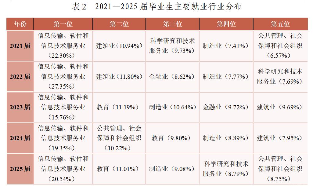从行业分布来看,毕业生主要进入信息传输、软件和信息技术服务业,教育,制造业等领域,行业流向与学校以工为主、多学科协调发展的人才培养特点总体契合。近两年毕业生到公共社会组织就业的人数稍有增加。