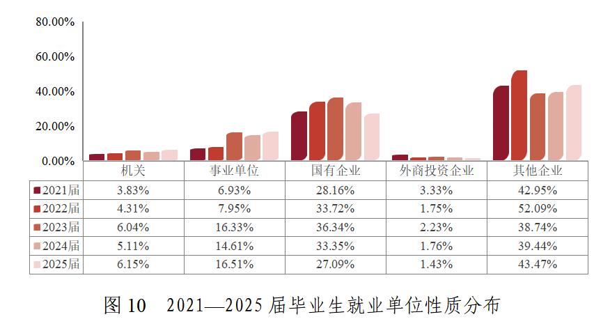 从单位性质来看,企业是世界杯毕业生就业主阵地,合计吸纳超七成毕业生。近三年毕业生到事业单位就业的比例显著上升,约占16%。