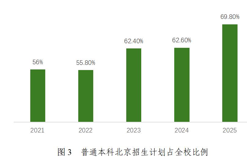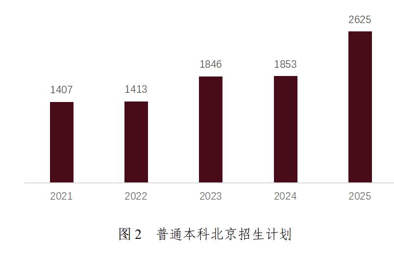 学校积极响应首都教育“扩容提质”要求,本科招生规模五年间增长38.99%。在京普通本科(不含专升本、二学位等)招生计划增长明显,从2021年的1407人增至2025年的2625人,增幅达87%,在全校普通本科招生计划中的占比从56%提升至69.8%。