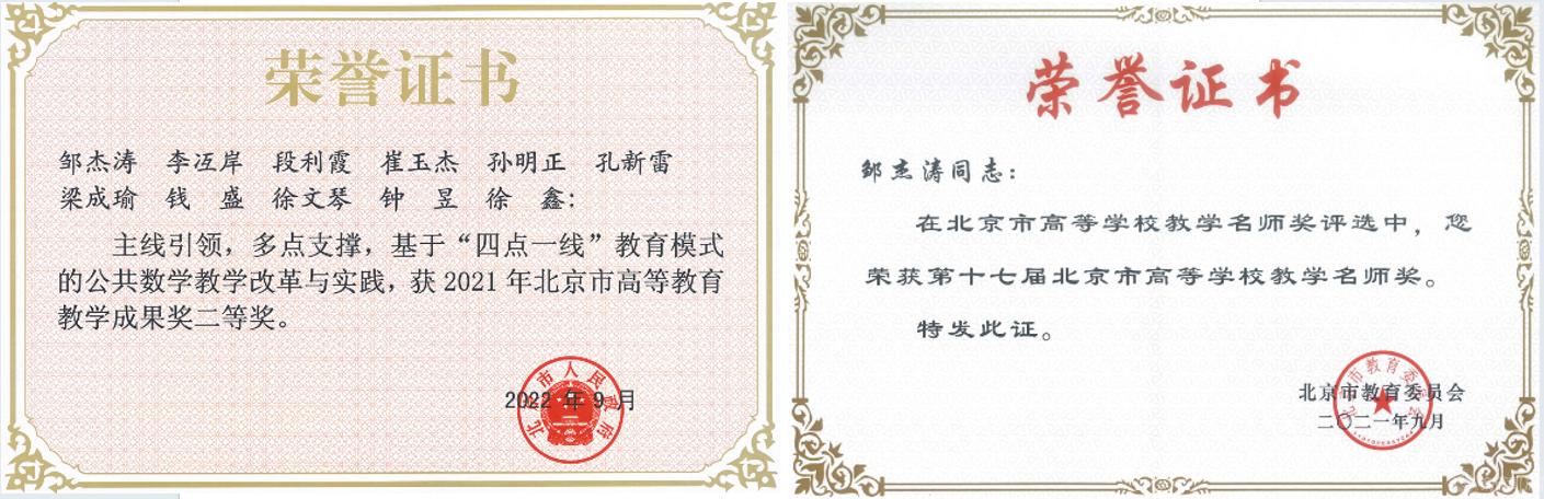 公共数学提质增效。学院深化完善基于专业背景的公共数学基础课程体系,根据专业属性,开设了5大类高等数学课堂。针对学生学习水平的差异,开设了实验班层、A层、B层三个层次的分层班。深化完善基于成果导向的数学提高课程体系,开设了强化夯实基础的高等数学提高课程,面向数学类竞赛的高等数学提高II课程,面向深造需求的大学数学提高系列课程。公共数学教学取得显著成效,成果荣获北京市高等教育教学成果奖二等奖(2021);3个数学类课程教案获评3项“北京高校优质本科教案”;《线性代数及其应用》、《概率论与数理统计》被评为“北京高校优质本科教材”;《概率论与数理统计》 被评为北京市优质本科课程;1名数学教师获“北京高校教学名师奖”,3名数学教师分别在第十二届、第十三届、第十四届北京市青年教师教学基本功大赛中斩获2个一等奖和1个二等奖。