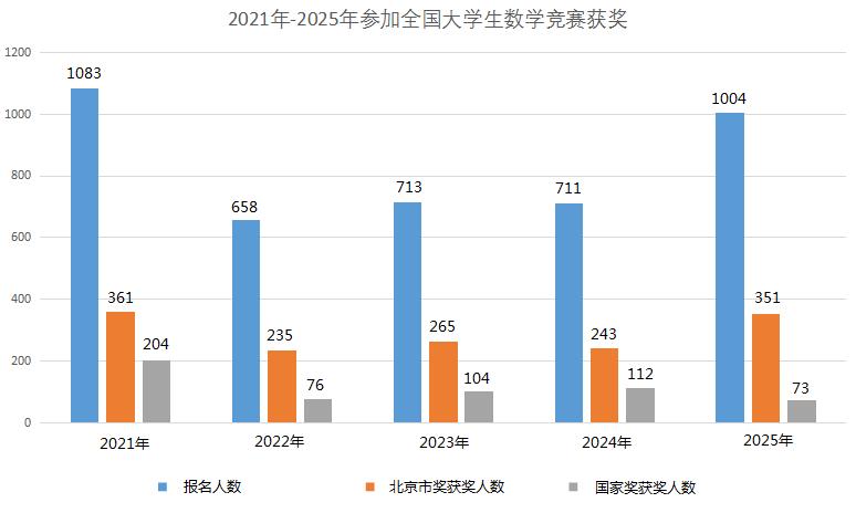 数学建模竞赛成绩逐年提升,2025年获全国二等奖1项、北京市级奖9项,研究生数学建模国家奖9项。全国部分地区大学生物理竞赛年均获奖四十余项;2025年参加全国大学生物理实验竞赛获全国奖7项;市场调查与分析大赛每年均有团队获全国一、二等奖。