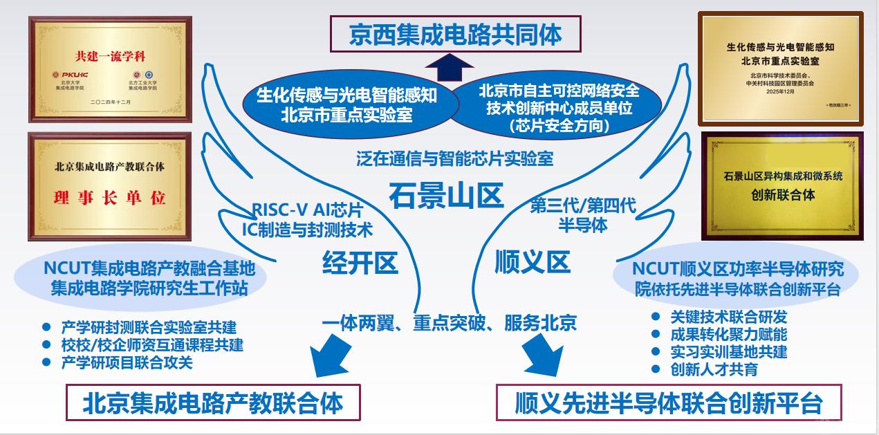 专业建设方面,体系化布局,精准化对接。学院基于微电子科学与工程(北京市一流本科专业建设点),2025年完成集成电路设计与集成系统本科专业的正式申报、电子封装技术本科专业的预申报(备案),适配产业需求的人才培养链条初步搭建成型。设有“芯片制造”(北航)与“电子封装”(北理)双培班、校内“菁英班”(与北大共建)、“芯片设计与测试”产教融合特色班,集成电路测试为特色发展方向。通过创建基于“产教融合(实习实训基地)-科教融汇(实培深造平台)”人才培养模式,开展“5(学校)+1(企业)+1(学校)+1(企业)“交替式顶岗实习,缩短人才从校园学习到适配产业的成长周期。