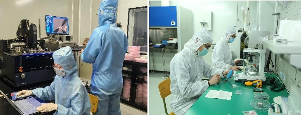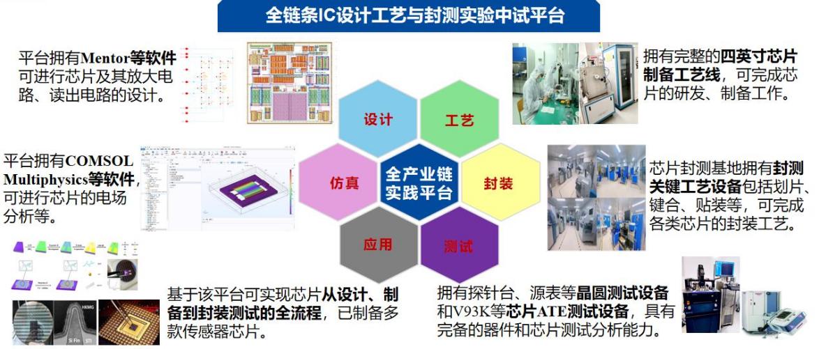建设校内全链条 IC 设计工艺与封测平台。学院建设有近 300 平方米的万级微纳加工超净间及 200 平方米的封测超净间,拥有近完备的 4 英寸集成电路工艺线和工信部授牌的“芯片封测就业创业创新示范实践基地”(车规级芯片封测示范实践基地)。保障学生实验、教师科研外,同时为其他高校、科研院所及产业内相关企业提供服务。