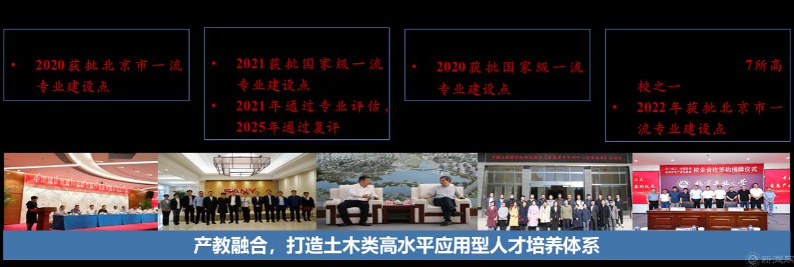 专业建设及转型发展成效显著。对标国家重大战略和行业转型升级需求,对传统土木类专业进行智能化、信息化升级改造。新增1个国家级一流专业建设点(工程管理)、2个北京市一流专业建设点(智能建造、土木工程),工程管理专业2021年通过住建部专业评估认证并于2025年通过复评。新设置的智能建造专业已顺利培养3届毕业生,实践教学水平走在全国前列;依托地空专业新申报了“智慧应急”专业;设置了“韧性城市安全与风险防控”和“建筑节能与低碳设计”(与数字产业学院共建)两个微专业。