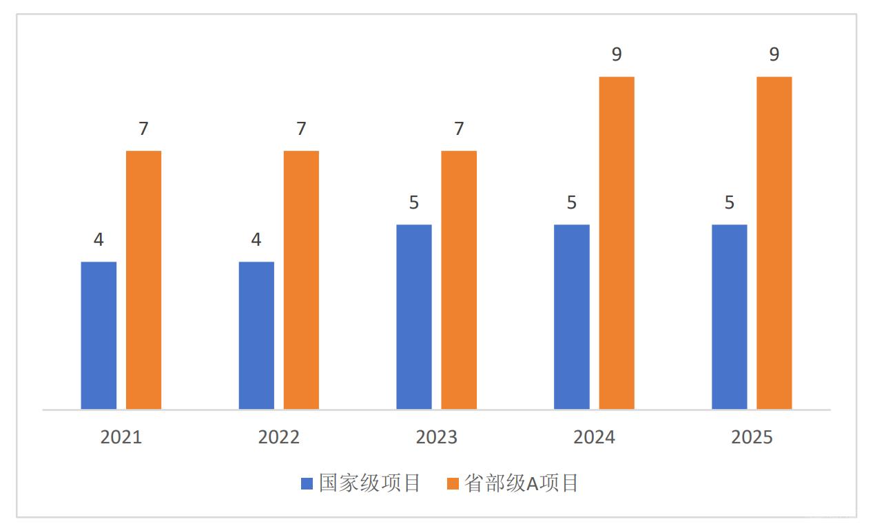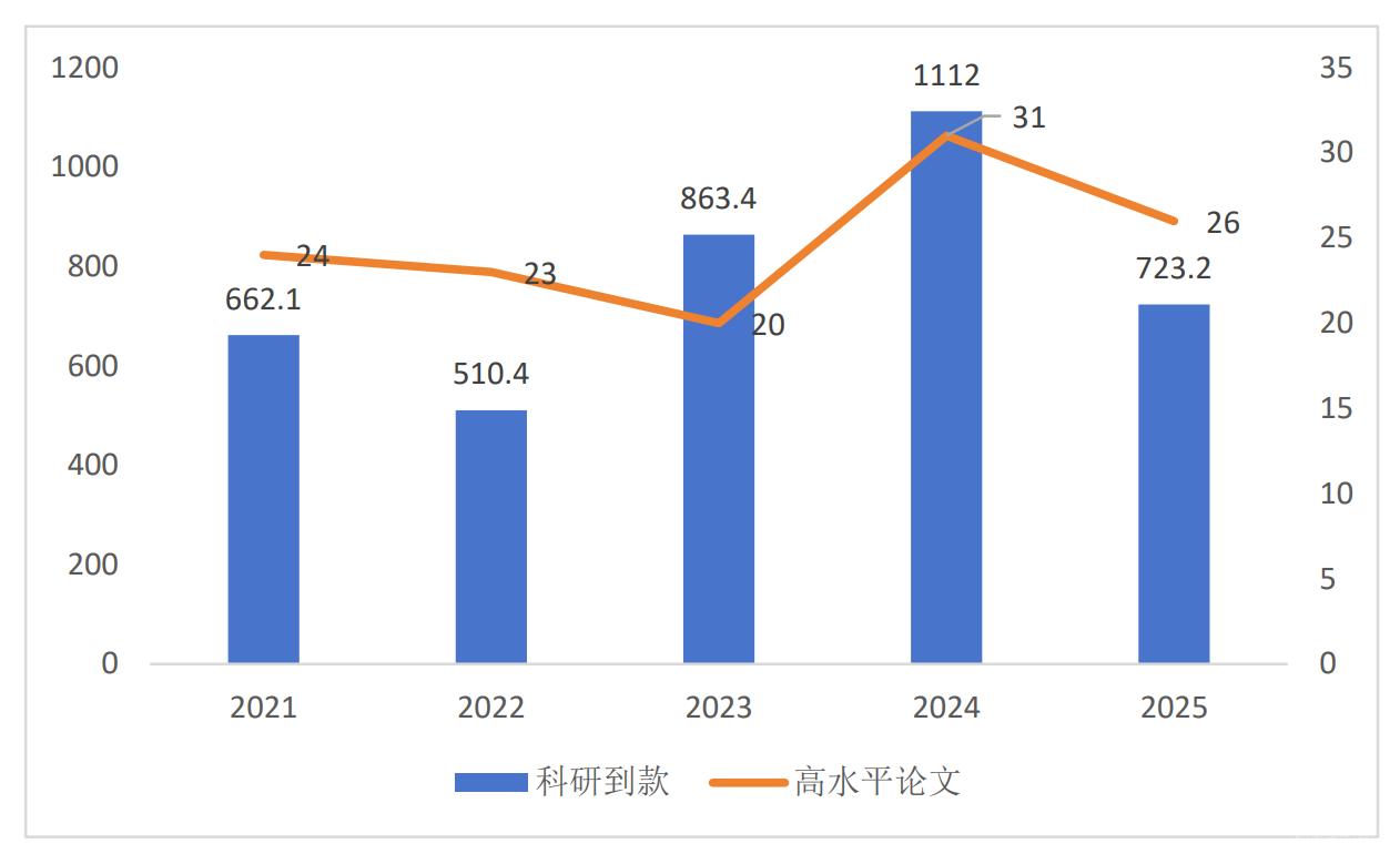 “十四五”期间,到款科研经费合计3871.1万,较“十三五”时期增长48.3%,其中横向经费2811.6万,增长53.7%,纵向经费1059.5,增长35.8%。年度到款额在2024年首次突破1000万元,科研经费规模与结构持续优化。“获批国家级课题23项,省部级A类课题39项。以第一单位申报获批的国家社科基金项目从“十三五”期间的1项增至11项;省部级以上采纳智库成果从2项增至21项。