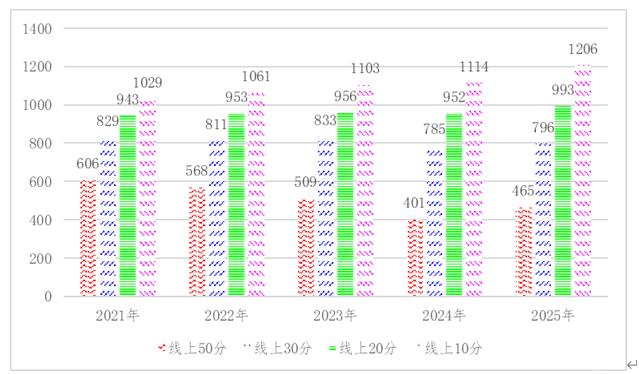 按考生初试分数高出教育部划定的复试分数线绝对分数梯度测算,超过国家录取线10分以上的考生逐年增长,到2025年达到1206人;各个分数段高分考生2025年均高于2024年,表明在总报名人数下降的情况下,招生质量保持上升趋势。