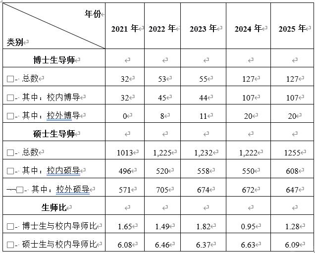 为支撑博士学位授予单位建设,学校博士生导师队伍实现跨越式增长。至2024年博士生导师总数达127人(2025年尚未最终确定),较2021年增长297%。硕士生导师队伍规模稳定增长,2025年为1255人(含校外导师)。其中,来自其他高校的校外导师178人,占校外导师人数的27.51%,来自企业的校外导师469人,占校外导师人数的72.49%。博士的生师比为1.28:1,硕士生师比为6.09:1,生师比近五年基本保持稳定,为研究生培养质量提升提供了关键的师资保障。