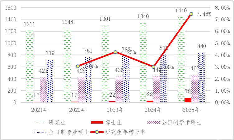 “十四五”期间,学校适度扩大研究生招生规模,全日制博士生、学术学位硕士生、专业学位硕士生招生人数均逐年增长。其中博士生从2024年的28人直接增至2025年的78人;学术硕士从2021年的421人增至2025年的462人,总增长率为9.74%;专业硕士研究生从2021年的719人增至840人,增长率达16.83%。