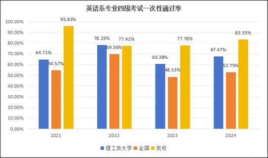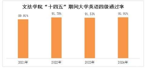 职业考试表现优异。英语专业专四一次性通过率达83.59%,远超全国平均;大学英语四级通过率91.28%;法学专业法考通过率稳步上升。