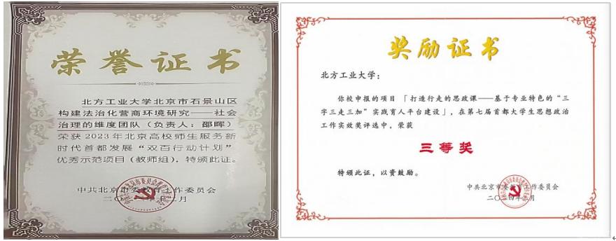 创新“党建+专业”深度融合机制。扎实推进基层党建重点任务与专业转型、涉外法治人才培养、素质教育2.0、城市治理研究等中心工作深度融合,打造“行走的思政课”等育人品牌,实践育人成果获市级奖项,两个团队入选北京高校师生服务新时代首都发展“双百行动计划”优秀示范项目,1人获评北京市优秀共青团干部。“十四五”期间,学院累计18人次获省部级以上奖励,113人次获校级奖励。