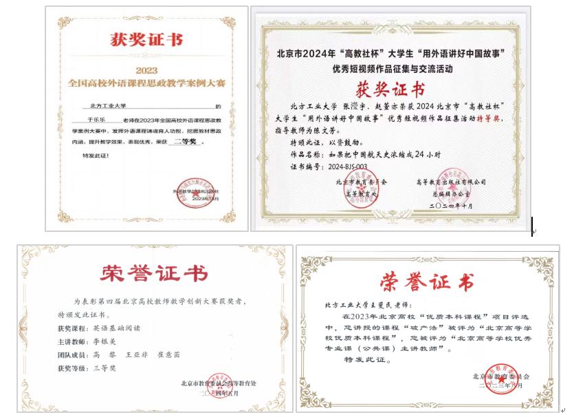 教师教学能力持续提升。教师在高校教师教学创新大赛、外语课程思政教学案例大赛等赛事中获奖4项,多个团队及个人在市级教改课题、教学示范案例、优质本科教案评选中屡获佳绩。
