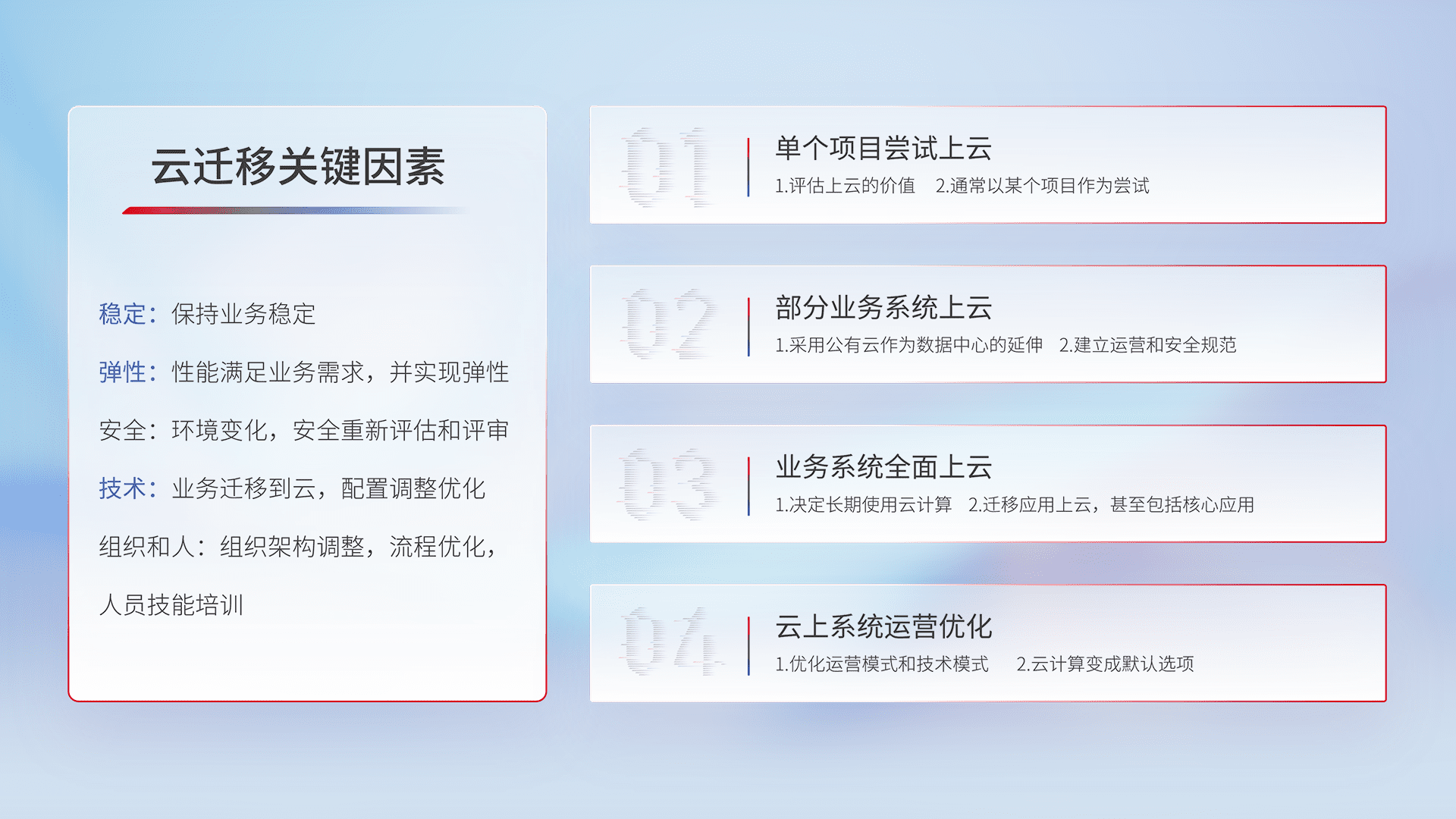 结合实际业务,,,从规划设计、、、云平台选型、、、、云原生改造、、、数据迁移、、集成交付,,,迁移全过程为客户识别最佳上云路径,,,,做好风险识别管理,,,设计网络架构、、、身份权限、、、、安全审计合规、、操作审计、、、、日志审计、、监控告警策略、、、多站点容灾设计等,,对云上基础设施进行整体规划,,提升IT治理水平,,,,以满足弹性、、、、高可用、、高性能的需求。。。