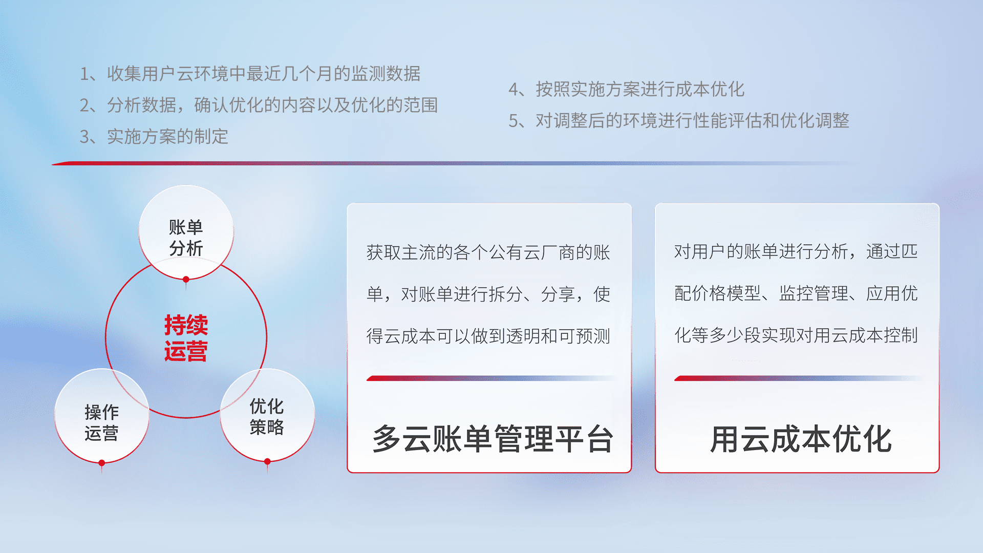 通过多云纳管,,,,以统一的资源数据模型把客户的云资源进行抽象和封装,,,,进而实现对多云资源的统一操作,,,保障云资源管理的可靠性、、、稳定性与可用性。。。。量身定制化运维内容,,,配置、、、、开发运维、、、补丁管理、、备份、、监控、、认证和访问管理、、、审计和日常巡检等,,,保障在用云过程中的可靠度,,稳定度以及高可用率。。。