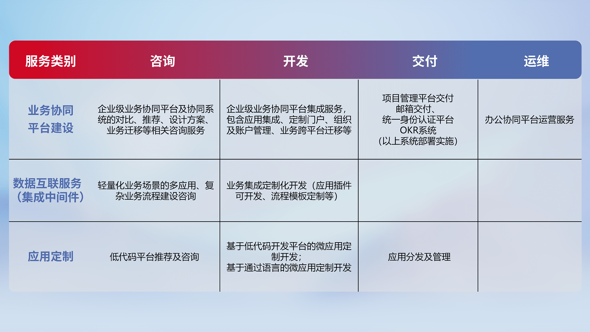 针对钉钉、、企微、、、IDaas等平台级产品提供产品的规划、、方案、、、交付、、、、定制化开发等服务,,,实现如统一协同办公、、、智能客户服务、、、、混合会议管理、、、、智能数据查询、、等业务场景,,,,实现数字化转型。。